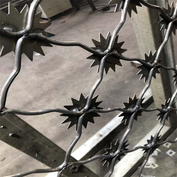 太陽(yáng)花鋼網(wǎng)墻又稱太陽(yáng)花隔離網(wǎng),此種產(chǎn)品一改往常鋼網(wǎng)墻長(zhǎng)方形的網(wǎng)孔形式,采用菱形孔的美格網(wǎng)網(wǎng)片,在網(wǎng)片的每個(gè)截點(diǎn)焊接梅花形刺片,因其特殊的外形,相較于之前的普通鋼網(wǎng)墻,無(wú)法采取腳踩、手握的方式翻越,防攀爬性能、安全性能有所增強(qiáng)。表面處理多采取熱浸鍍鋅的形式,也有要求較高的地方采用不銹鋼材質(zhì)的鋼網(wǎng)墻,防腐蝕效果更佳。