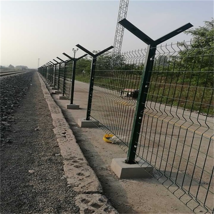 Y型隔離柵規(guī)格:2500x2000mm, 絲徑:5.0mm,網(wǎng)孔:50x50mm(斜方正孔),邊框采用40x40x2.5mm。
