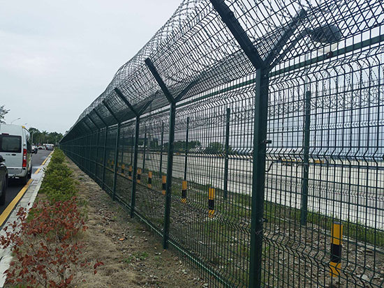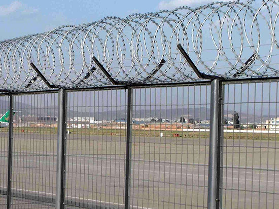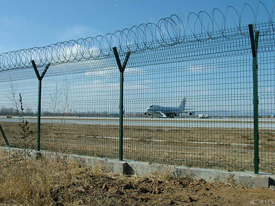 機場圍界網(wǎng)頂部加裝刀片刺絲、刀片刺網(wǎng)后又很好的增強了安全防護性能。其產(chǎn)品造型美觀、花色多樣,既起到圍欄作用,又起到美化作用。由于具有安全性高、防攀爬能力好,網(wǎng)片連接方式采用特制SBS緊扣件,有效防止人為的破壞性拆卸,橫向四道折彎加強筋,使網(wǎng)面強度顯著增加。