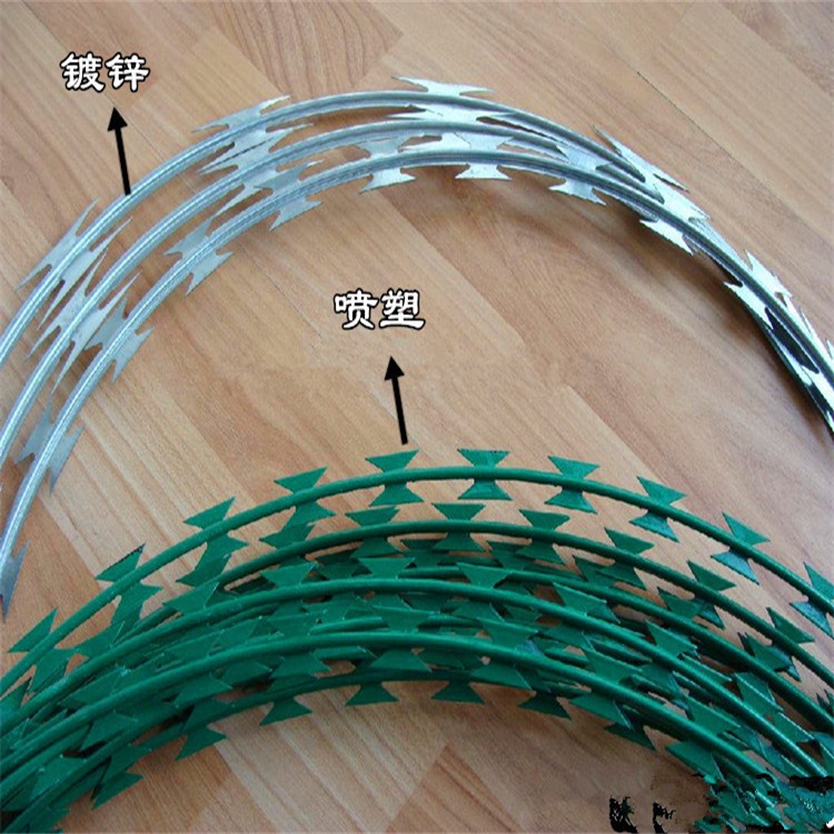 刀片刺繩規(guī)格型號為BTO-22,刀片厚度0.5±0.05,刀長22±1,刀寬15±1(單位:mm),直徑為80cm,材質為熱鍍鋅,上鋅量30g左右,刺繩拉開后間距在20cm左右。