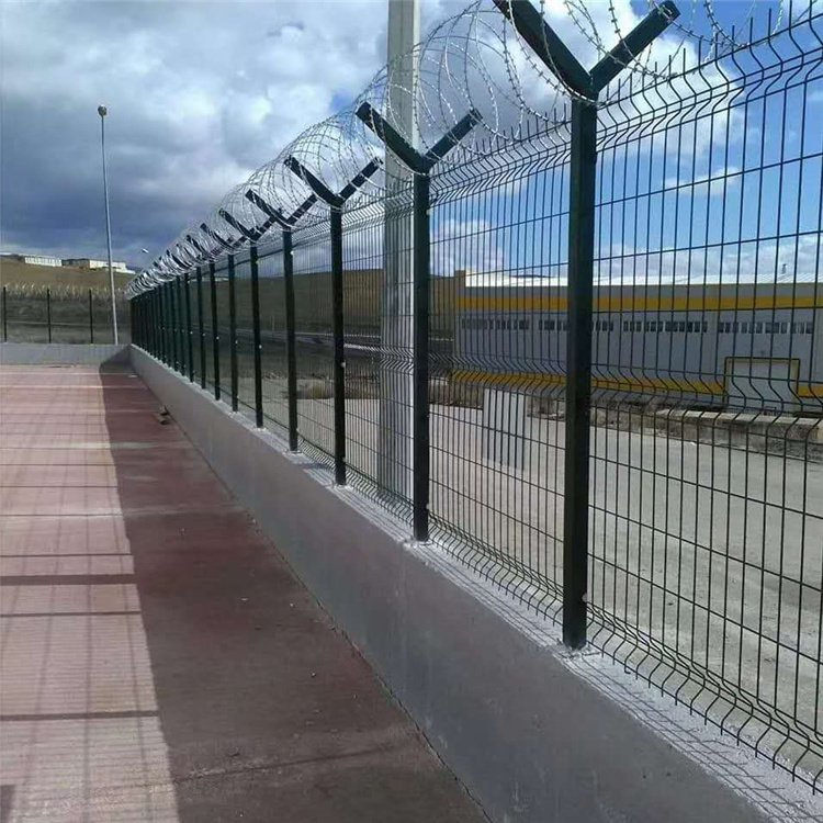 機(jī)場圍界網(wǎng)常用的兩種結(jié)構(gòu)有雙邊絲的和框架的,而機(jī)場圍界網(wǎng)是一種高安全隔離防護(hù)網(wǎng),這種新型隔離網(wǎng)一般由鋼筋焊接網(wǎng)、Y型防護(hù)立柱以及蛇腹式刀刺網(wǎng)等幾大主體組成。既有良好的通透性,又能起到強(qiáng)有力的安全隔離防護(hù)效果。頂部加裝刀刺網(wǎng),鋒利的刀型,有效制止的攀爬行為,強(qiáng)有力的發(fā)揮著保護(hù)機(jī)場作用。