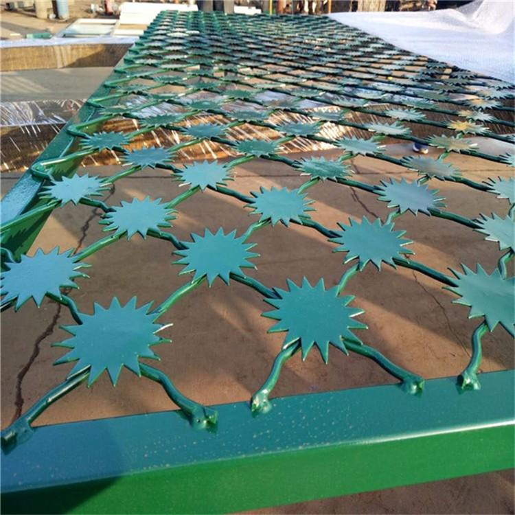 今天和大家說的是梅花刺片隔離網(wǎng)的太陽刺花直徑規(guī)格。這里說的太陽刺花其實(shí)就是隔離網(wǎng)上面那一朵朵'小花朵’, 一般監(jiān)獄防爬太陽花鋼網(wǎng)墻高度3--5米,立柱跨度為2.5米--3米。是由防盜美格網(wǎng)加焊防爬刺片而成,美格網(wǎng)的網(wǎng)孔一般為:100X100mm,絲徑為:5-8mm,刺片直徑50-150mm,形狀似太陽,四周布滿刺尖。焊接在美格網(wǎng)每一個(gè)交接點(diǎn)處,是由二氧化碳保護(hù)焊進(jìn)行焊接的,網(wǎng)邊框?yàn)?/span>20X30mm、40X60mm、鍍鋅方管,壁厚不得少于1.5mm,然后把焊接打磨好的邊框與網(wǎng)片連接,再經(jīng)過靜電噴涂就算成品了。每個(gè)網(wǎng)孔里面的留孔尺寸為3公分,即滿足通透金屬隔離網(wǎng)的要求,又實(shí)現(xiàn)防攀爬的目的。