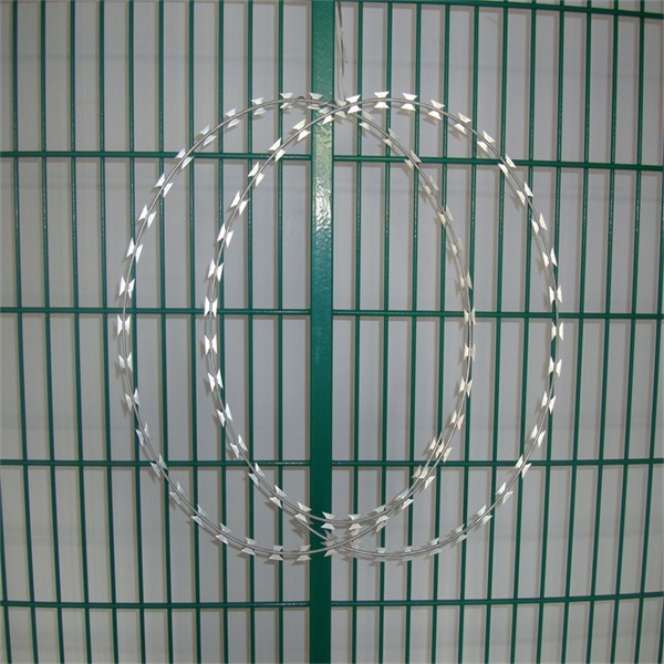 螺旋型交叉式刀片刺絲是在兩條刀片刺絲之間以不銹鋼片和鍍鋅鋼片強力夾和,展開后即成交叉狀,取其美觀又實用。