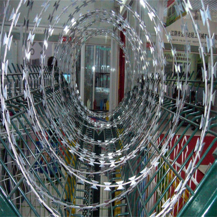 刀片刺繩屬于一種優(yōu)質(zhì)的阻絕措施,由不銹鋼板或者鍍鋅鋼板經(jīng)過沖壓刀型和芯線制成,芯線一般是由具有很大張力的鋼絲做成的,原材料的特性造就了刀刺網(wǎng)具有防破壞、防腐蝕等特點。刀刺網(wǎng)具有銳利的刀尖,所以從外觀上來看就給人一種恐怖的感覺。這種獨特的結(jié)構(gòu)賦予了刀刺網(wǎng)良好的防護功能,很多高安全場所、高級住宅區(qū)就是利用了刀刺網(wǎng)良好的防阻效果,將刀刺網(wǎng)普遍地安裝到了外圍墻上,使場地和住宅區(qū)的安全得到了保障。