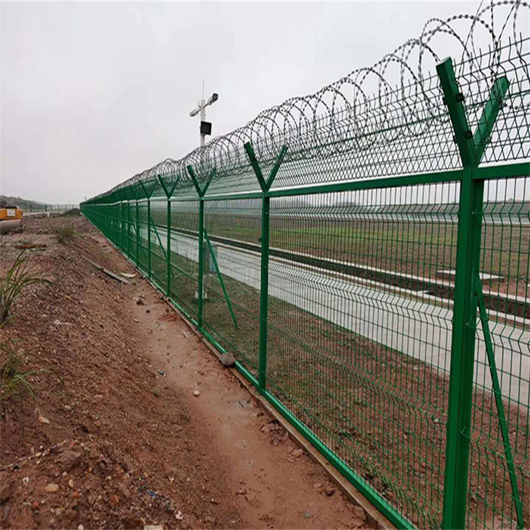 機(jī)場(chǎng)護(hù)欄網(wǎng)規(guī)格是:網(wǎng)高2.4米(帶刀片刺網(wǎng)3米) 50*100mm網(wǎng)孔 網(wǎng)片帶四道三角折彎, 塑后5.0mm 6.0mm,立柱60*80mm的方管,機(jī)場(chǎng)防護(hù)網(wǎng)又稱作“Y型安全防御護(hù)網(wǎng)”,是由V型支架立柱,加強(qiáng)型焊接片網(wǎng),安全防盜連接件和熱鍍鋅刀片刺網(wǎng)組成強(qiáng)度和安全防御性級(jí)別很高。近年來,被廣泛應(yīng)用在機(jī)場(chǎng),保護(hù)基地等高安全場(chǎng)所。