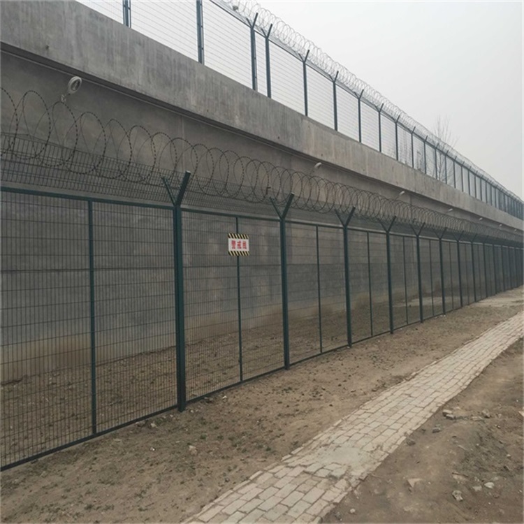 4、獄墻頂部隔離網(wǎng)網(wǎng)孔要求豎向排列,網(wǎng)面緊固牢靠、平整美觀,每單元網(wǎng)片每側(cè)不少于六個(gè)連接固定點(diǎn)。
