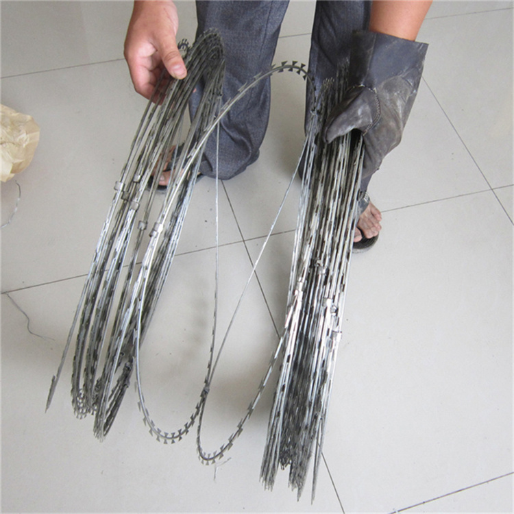 1,制作刀片:選用優(yōu)質(zhì)Q195L熱鍍鋅帶鋼(或者不銹鋼帶鋼),根據(jù)客戶(hù)選定的花型,經(jīng)高速?zèng)_床,沖軋成鋒利的刀片刺條,把刀片刺條纏成圓餅狀。