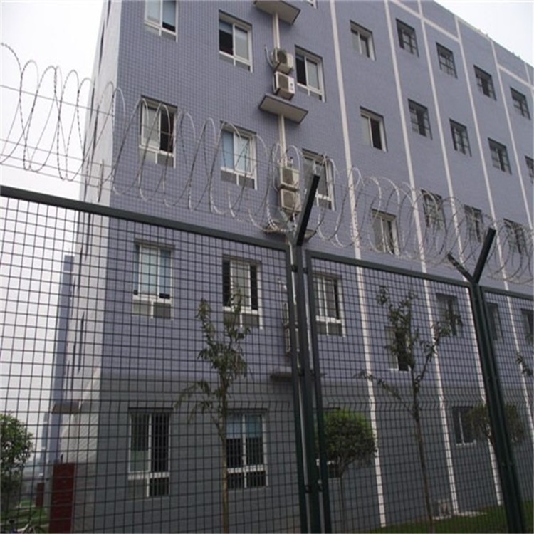 飛行區(qū)鋼網(wǎng)墻用V型支架在 頂部加裝蛇腹型刀刺網(wǎng),形成一道難以逾越的隔離墻屏障,從而有效地增加飛行區(qū)鋼網(wǎng)墻的防攀爬性和安全性。