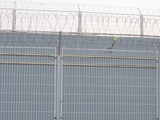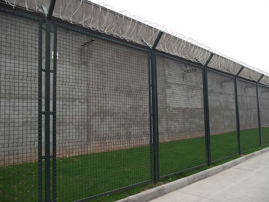 監(jiān)獄鋼網(wǎng)墻:一般鋼網(wǎng)墻高度3--5米,立柱跨度為2.5米--3米。是由防盜美格網(wǎng)加焊防爬刺片而成,美格網(wǎng)的網(wǎng)孔一般為:100X100mm,絲徑為:5-8mm,刺片直徑50-150mm,形狀似太陽,四周布滿刺尖。焊接在美格網(wǎng)每一個(gè)交接點(diǎn)處,是由二氧化碳保護(hù)焊進(jìn)行焊接的,網(wǎng)邊框?yàn)?0X30mm、40X60mm、鍍鋅方管,壁厚不得少于1.5mm,然后把焊接打磨好的邊框與網(wǎng)片連接,再經(jīng)過靜電噴涂就算成品了。