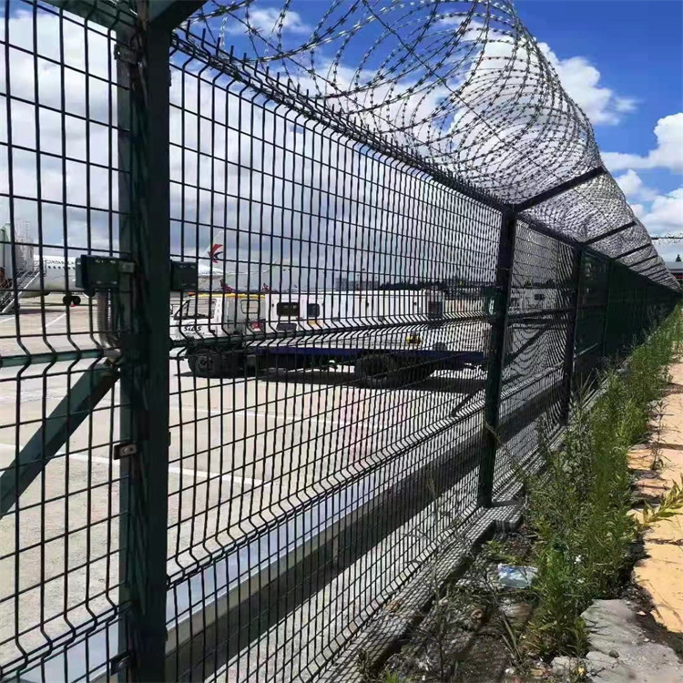 飛機(jī)場(chǎng)外圍隔離柵采用V型支架立柱加強(qiáng)型焊接片網(wǎng),安全防盜連接件和熱鍍鋅刀片刺網(wǎng)組成強(qiáng)度和安全防御性級(jí)別很高。被廣泛應(yīng)用在機(jī)場(chǎng),軍事基地等高安全場(chǎng)所。