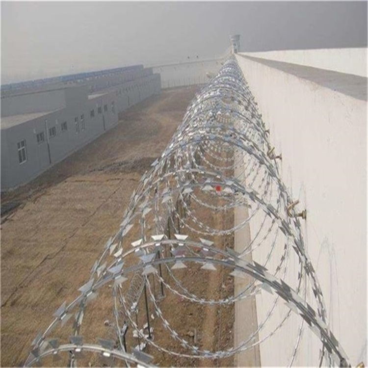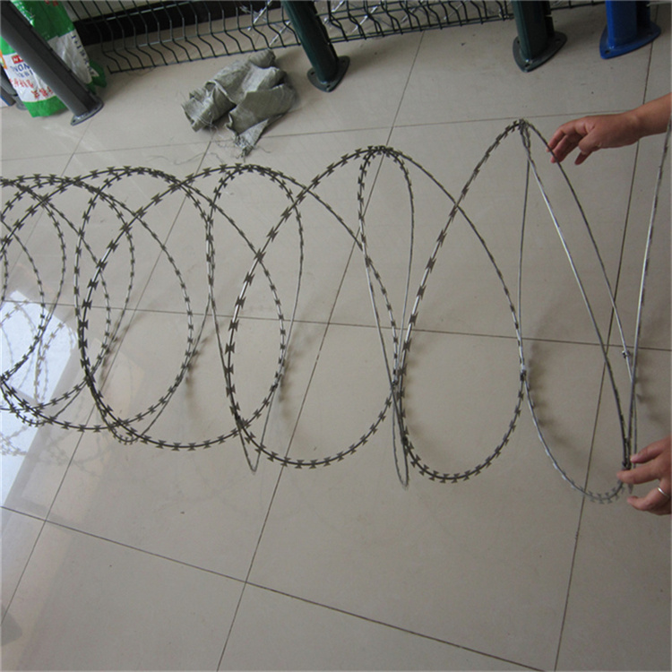 螺旋單一型刀片刺繩是由一根蛇腹型刀片刺繩環(huán)繞而成,不需要使用卡子來固定,按照其展開的自然形式進(jìn)行安裝。刀片刺繩布置的一種,它沿墻壁或柵欄自然環(huán)繞來達(dá)到防護(hù)目的。選用優(yōu)質(zhì)低碳鋼絲, 鍍鋅、涂塑、噴塑。特點(diǎn)是網(wǎng)身剛硬,不必用張力絲、不需要高技術(shù)工人維護(hù)、易安裝、維護(hù)成本低。