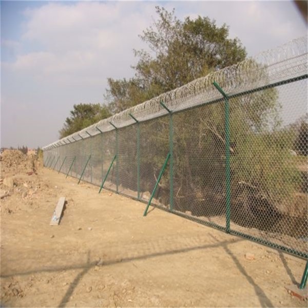 艾瑞機場封閉網(wǎng)頂部安裝的刀片刺網(wǎng)直徑在500mm、600mm、700mm,刺圈間距20-25cm。機場鋼筋封閉網(wǎng)的立柱基礎(chǔ)應(yīng)采用現(xiàn)澆混凝土制成,截面500*500mm,高度800mm。