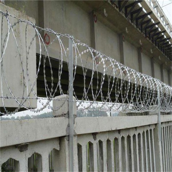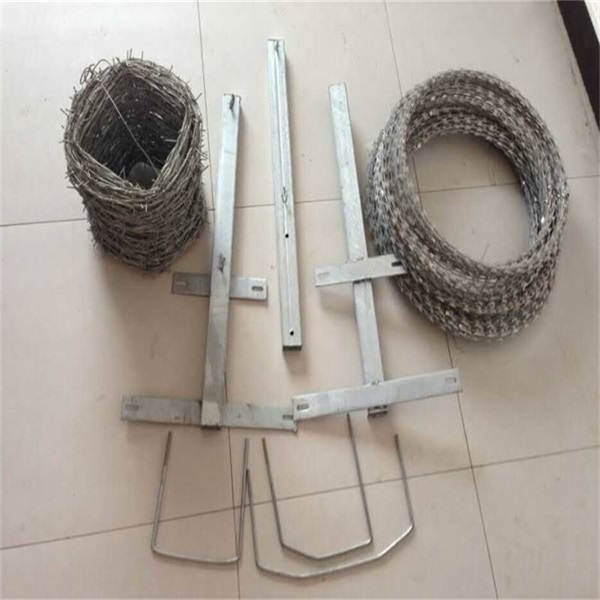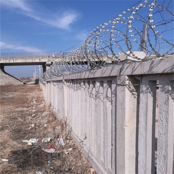 刺絲滾籠的下緣距離鋼筋混凝土防護(hù)柵欄上緣的垂直距離為0.05m??v向拉筋采用熱鍍鋅刺絲,雙擰編織工藝,刺線2.2mm、主線2.5mm,刺絲連接卡采用鍍鋅鋼板沖壓或Q235碳鋼板沖壓在進(jìn)行鍍鋅。抱箍直徑為8mm外形與水泥柱護(hù)欄相結(jié)合專門定做并配備螺母及防盜墊圈,表面處理為鍍鋅分別有柱帽處支架抱箍、中間立柱支架抱箍、加密支架抱箍等三種。艾瑞刺絲滾籠的防護(hù)效果是很不錯的。