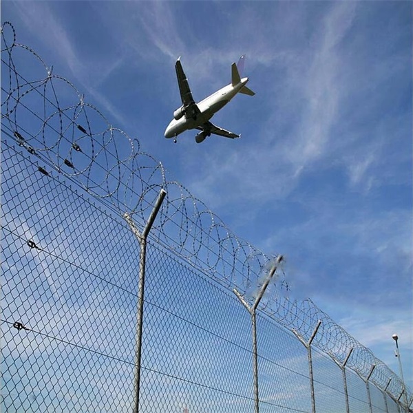 機場鋼絲網(wǎng)圍界網(wǎng)面是由直徑5mm的鋼筋排列成矩形網(wǎng)格點焊形成。相鄰橫筋間距不大于10cm,相鄰豎筋間 距不大于5cm.每片鋼筋網(wǎng)片寬度不大于3m,用螺栓固定在事先埋設(shè)好的立柱上.為增加圍界的穩(wěn)定性,一般每30m左右 增加一個斜撐.圍界上部50—60cm以30.—45.角向外傾斜,或設(shè)置滾筒形刺鐵絲網(wǎng)防止攀越。