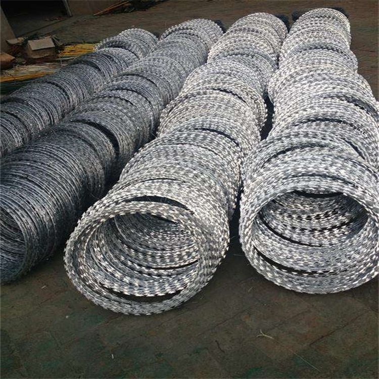 刺絲滾籠,是一種近年發(fā)展起來的防護、隔離能力較強的新型防護網產品。它采用鋼板沖壓成型包附于鋼絲(筋絲)之上,由銳利尖角鍍鋅鋼板或不銹鋼薄板做刀片,高張力鋼絲做芯線組合而成的。鋒利的刀型刺由雙線扣裝后成蛇腹狀,既美觀又讓人不寒而粟。起到了很好的阻嚇作用。