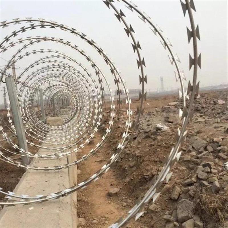 刀片刺籠是一種近年發(fā)展起來的防護、隔離能力較強的新型防護網(wǎng)產(chǎn)品。它采用鋼板沖壓成型包附于鋼絲(筋絲)之上,由銳利尖角鍍鋅鋼板或不銹鋼薄板做刀片,高張力鋼絲做芯線組合而成的。鋒利的刀型刺由雙線扣裝后成蛇腹?fàn)睿让烙^又讓人不寒而粟。起到了很好的阻嚇作用。